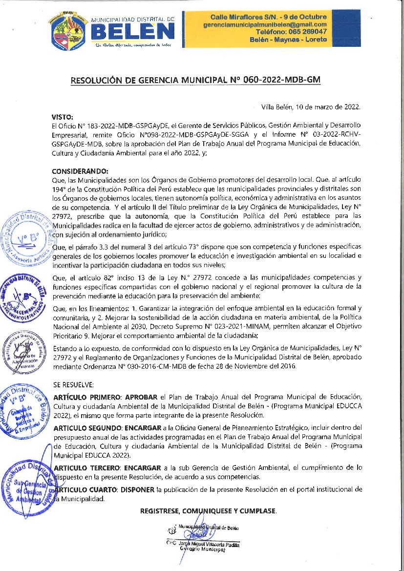 La presente Resolución aprueba el Plan de Trabajo 2022 del Programa Municipal de Educación, Cultura y Ciudadanía Ambiental de la Municipalidad Distrital de Belén, con la finalidad de definir las actividades de educación, cultura y ciudadanía ambiental que se desarrollarán en la localidad durante el presente año.