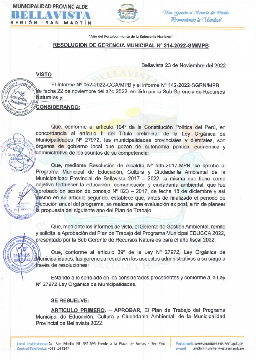 La presente Resolución aprueba el Plan de Trabajo 2022 del Programa Municipal de Educación, Cultura y Ciudadanía Ambiental de la Municipalidad Provincia de Bellavista, con la finalidad de definir las actividades de educación, cultura y ciudadanía ambiental que se desarrollarán en la localidad durante el presente año.