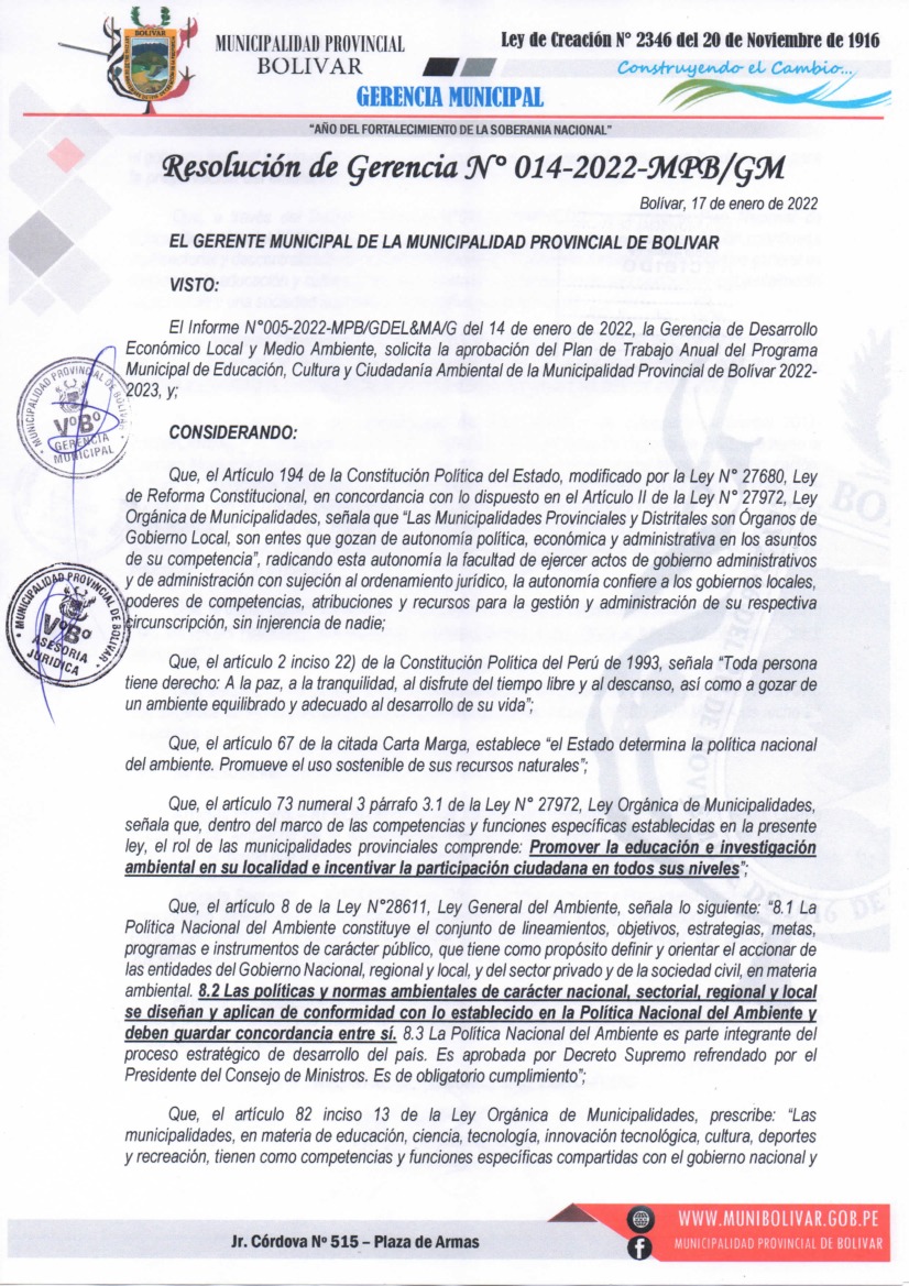La presente Resolución aprueba el Plan de Trabajo 2022 del Programa Municipal de Educación, Cultura y Ciudadanía Ambiental de la Municipalidad Provincial de Bolívar, con la finalidad de definir las actividades de educación, cultura y ciudadanía ambiental que se desarrollarán en la localidad durante el presente año.