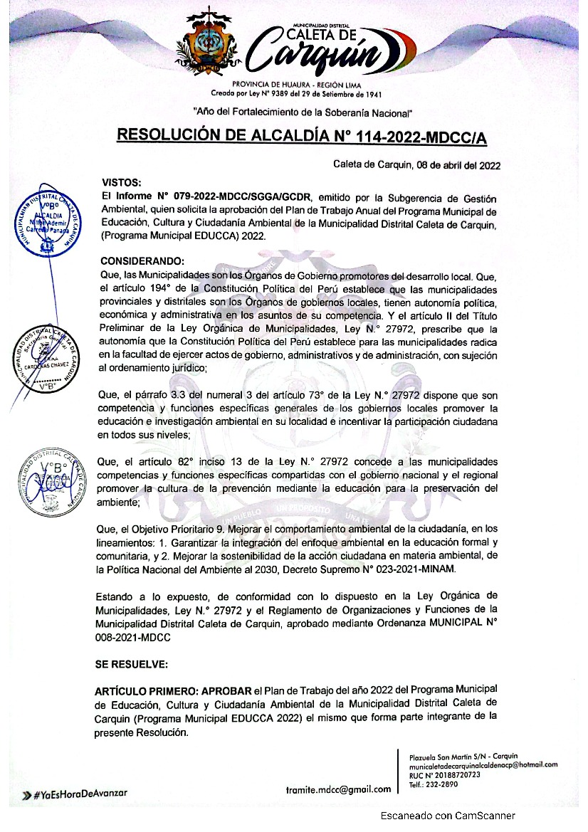 La presente Resolución aprueba el Plan de Trabajo 2022 del Programa Municipal de Educación, Cultura y Ciudadanía Ambiental de la Municipalidad Distrital de Caleta de Carquín - Huaura, con la finalidad de definir las actividades de educación, cultura y ciudadanía ambiental que se desarrollarán en la localidad durante el presente año