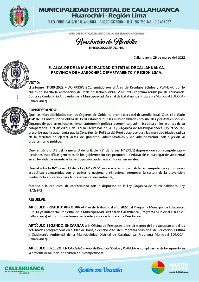 La presente Resolución aprueba el Plan de Trabajo 2022 del Programa Municipal de Educación, Cultura y Ciudadanía Ambiental de la Municipalidad Distrital de Callahuanca - Huarochirí, con la finalidad de definir las actividades de educación, cultura y ciudadanía ambiental que se desarrollarán en la localidad durante el presente año.