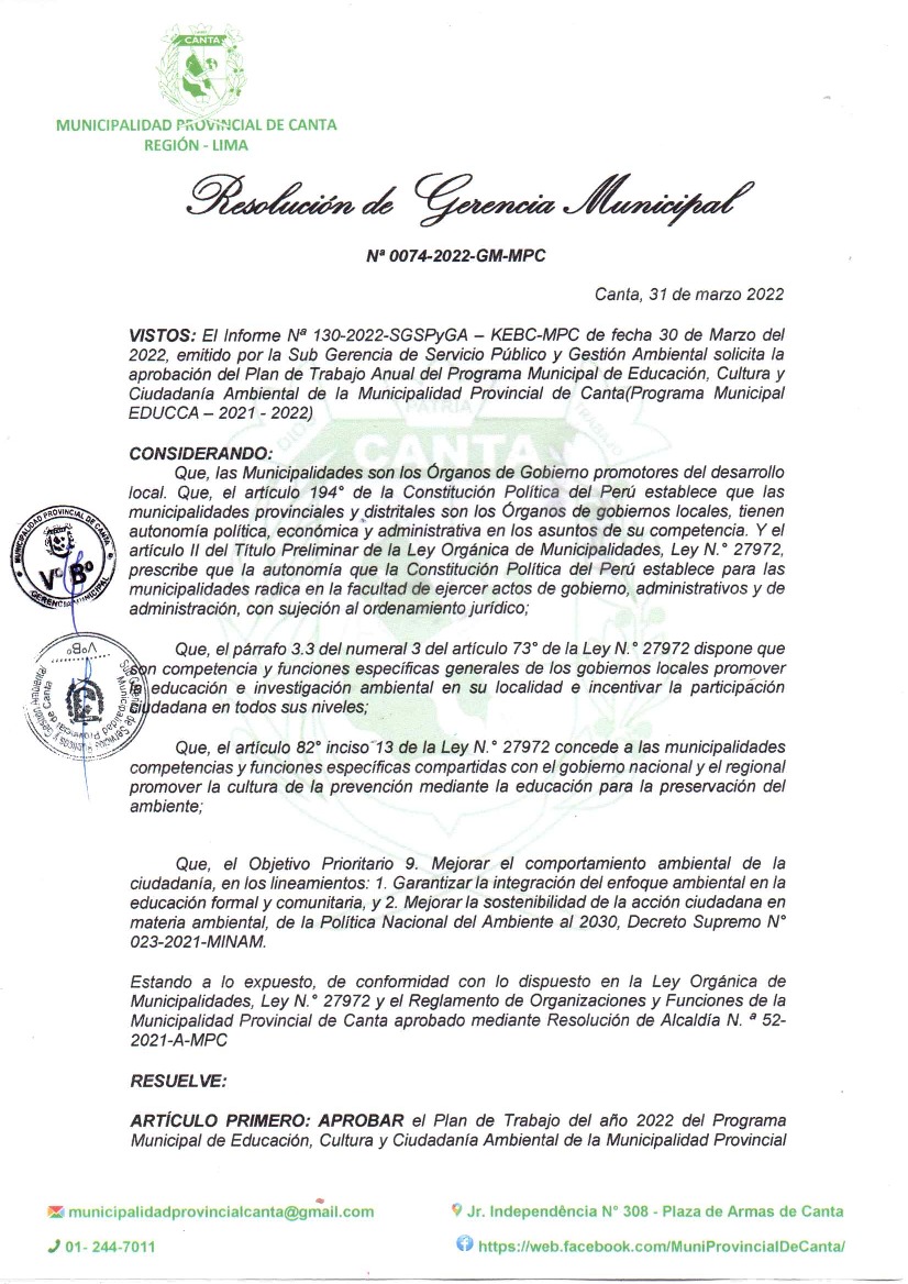 La presente Resolución aprueba el Plan de Trabajo 2022 del Programa Municipal de Educación, Cultura y Ciudadanía Ambiental de la Municipalidad Provincial de Canta, con la finalidad de definir las actividades de educación, cultura y ciudadanía ambiental que se desarrollarán en la localidad durante el presente año