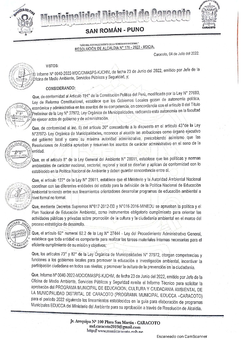 La presente Resolución aprueba el Plan de Trabajo 2022 del Programa Municipal de Educación, Cultura y Ciudadanía Ambiental de la Municipalidad Distrital de Caracoto, con la finalidad de definir las actividades de educación, cultura y ciudadanía ambiental que se desarrollarán en la localidad durante el presente año.