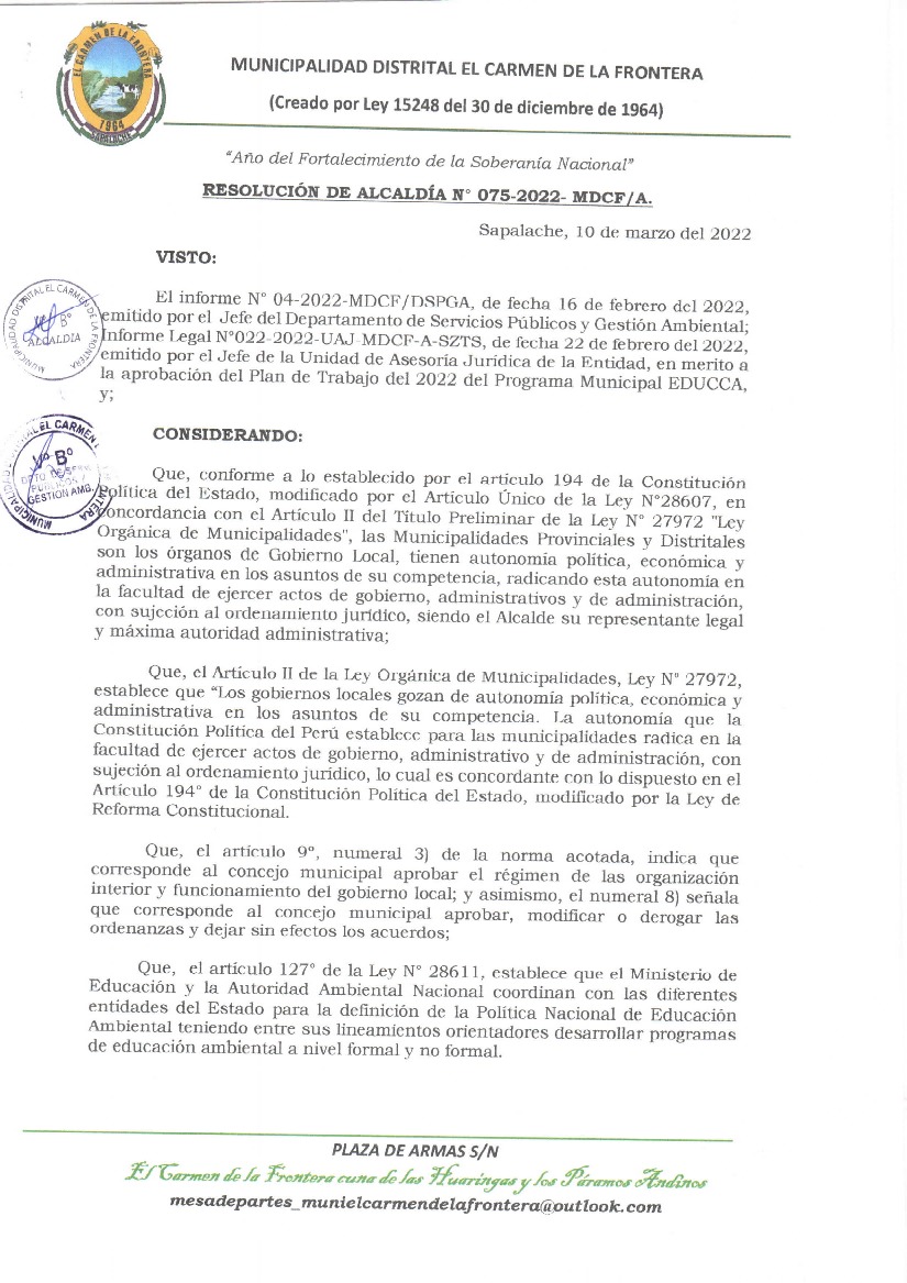 La presente Resolución aprueba el Plan de Trabajo 2022 del Programa Municipal de Educación, Cultura y Ciudadanía Ambiental de la Municipalidad Distrital de El Carmen de La Frontera, con la finalidad de definir las actividades de educación, cultura y ciudadanía ambiental que se desarrollarán en la localidad durante el presente año.