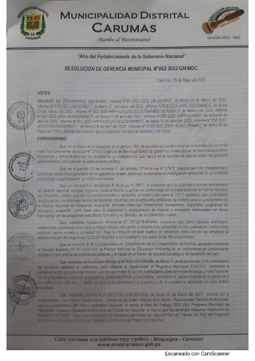 La presente Resolución aprueba el Plan de Trabajo 2022 del Programa Municipal de Educación, Cultura y Ciudadanía Ambiental de la Municipalidad Distrital de Carumas, Mariscal Nieto, Moquegua, con la finalidad de definir las actividades de educación, cultura y ciudadanía ambiental que se desarrollarán en la localidad durante el presente año.