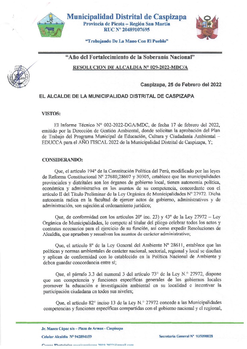 La presente Resolución aprueba el Plan de Trabajo 2022 del Programa Municipal de Educación, Cultura y Ciudadanía Ambiental de la Municipalidad Distrital de Caspisapa, con la finalidad de definir las actividades de educación, cultura y ciudadanía ambiental que se desarrollarán en la localidad durante el presente año.