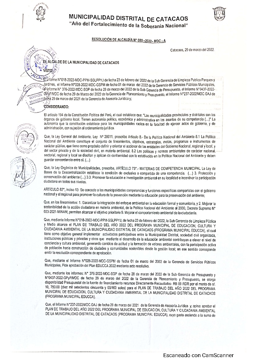 La presente Resolución aprueba el Plan de Trabajo 2022 del Programa Municipal de Educación, Cultura y Ciudadanía Ambiental de la Municipalidad Distrital de Catacaos, con la finalidad de definir las actividades de educación, cultura y ciudadanía ambiental que se desarrollarán en la localidad durante el presente año.