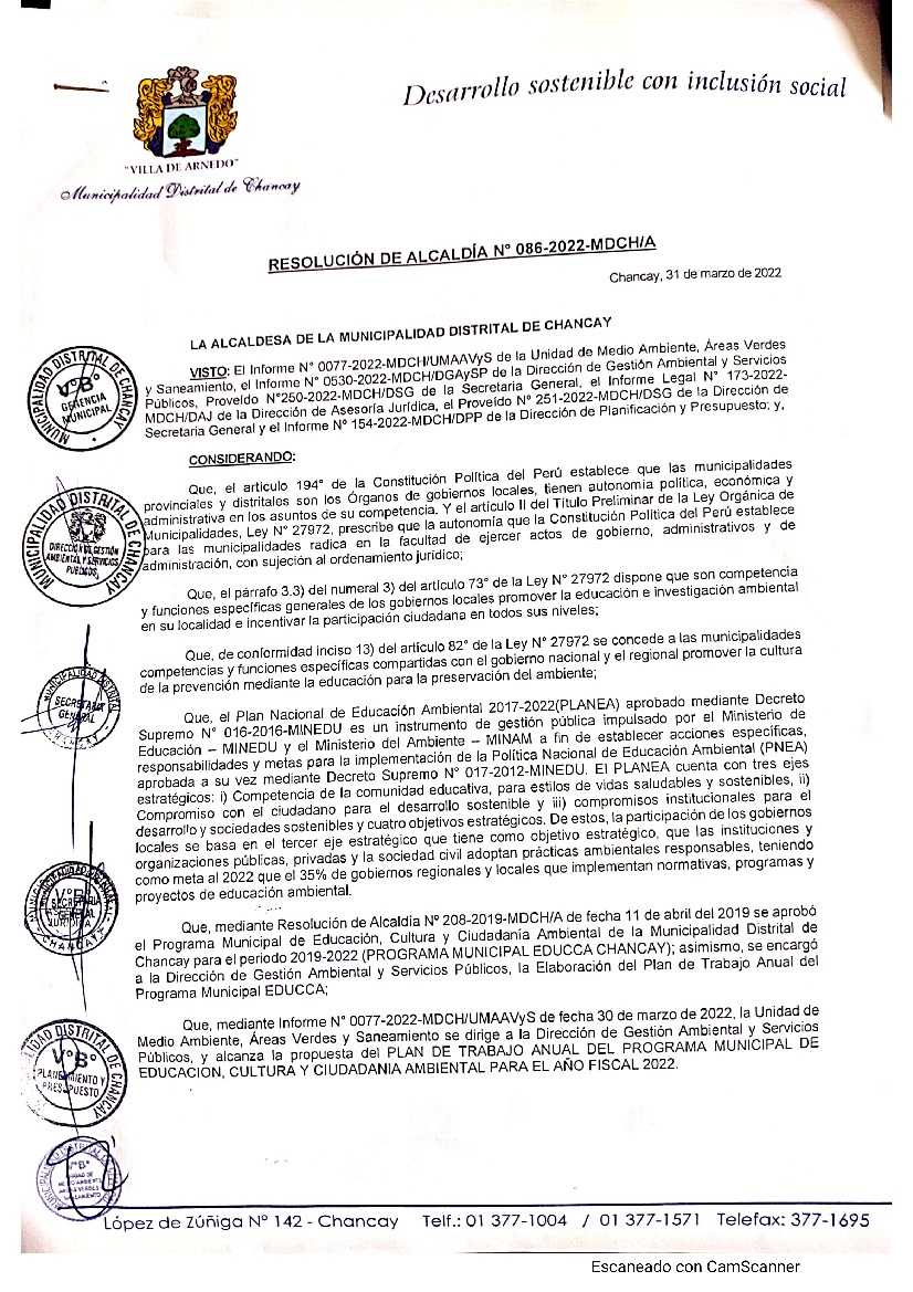 La presente Resolución aprueba el Plan de Trabajo 2022 del Programa Municipal de Educación, Cultura y Ciudadanía Ambiental de la Municipalidad Distrital de Chancay - Huaral - Lima, con la finalidad de definir las actividades de educación, cultura y ciudadanía ambiental que se desarrollarán en la localidad durante el presente año.