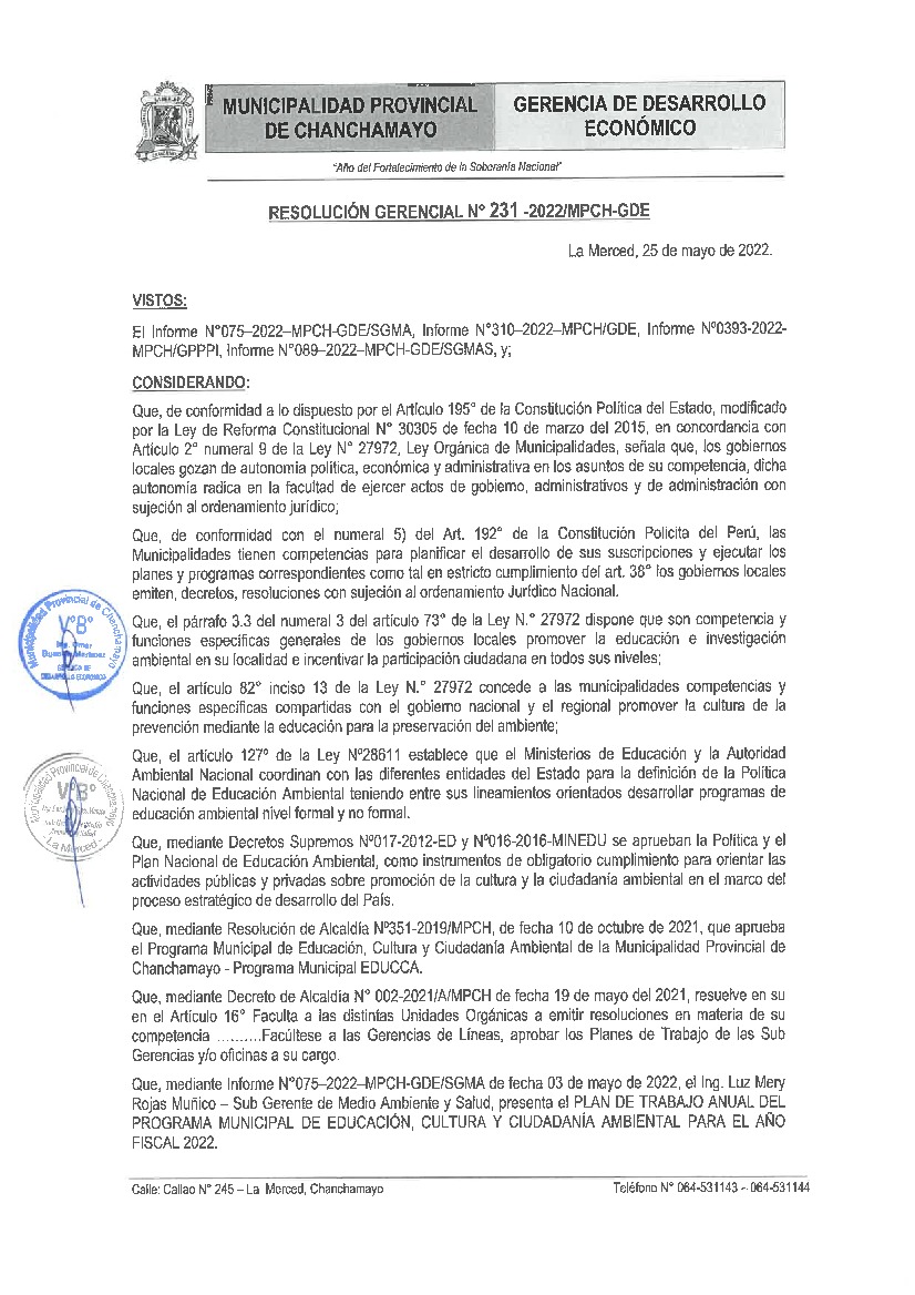 La presente Resolución aprueba el Plan de Trabajo 2022 del Programa Municipal de Educación, Cultura y Ciudadanía Ambiental de la Municipalidad Provincial de Chanchamayo, con la finalidad de definir las actividades de educación, cultura y ciudadanía ambiental que se desarrollarán en la localidad durante el presente año.