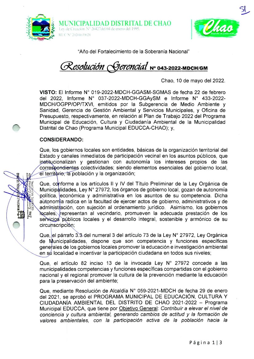 La presente Resolución aprueba el Plan de Trabajo 2022 del Programa Municipal de Educación, Cultura y Ciudadanía Ambiental de la Municipalidad Distrital de Chao, con la finalidad de definir las actividades de educación, cultura y ciudadanía ambiental que se desarrollarán en la localidad durante el presente año.