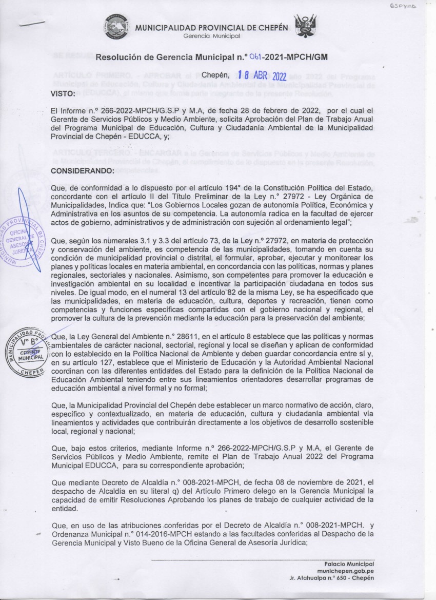 La presente Resolución aprueba el Plan de Trabajo 2022 del Programa Municipal de Educación, Cultura y Ciudadanía Ambiental de la Municipalidad Provincial de Chepén, con la finalidad de definir las actividades de educación, cultura y ciudadanía ambiental que se desarrollarán en la localidad durante el presente año.