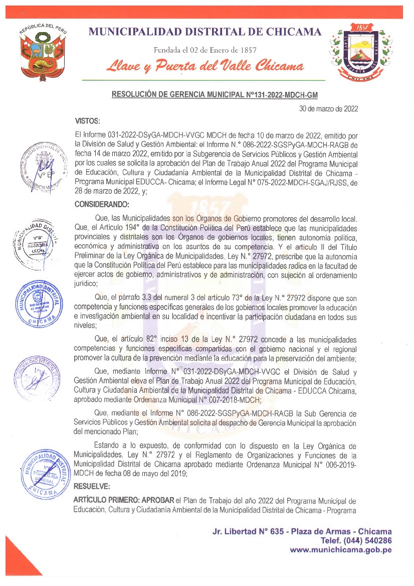 La presente Resolución aprueba el Plan de Trabajo 2022 del Programa Municipal de Educación, Cultura y Ciudadanía Ambiental de la Municipalidad Distrital de Chicama, con la finalidad de definir las actividades de educación, cultura y ciudadanía ambiental que se desarrollarán en la localidad durante el presente año.