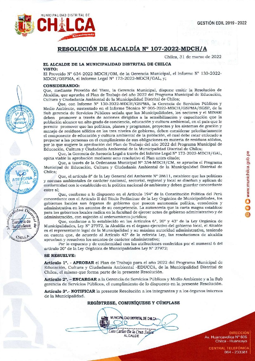 La presente Resolución aprueba el Plan de Trabajo 2022 del Programa Municipal de Educación, Cultura y Ciudadanía Ambiental de la Municipalidad Distrital de Chilca, con la finalidad de definir las actividades de educación, cultura y ciudadanía ambiental que se desarrollarán en la localidad durante el presente año.