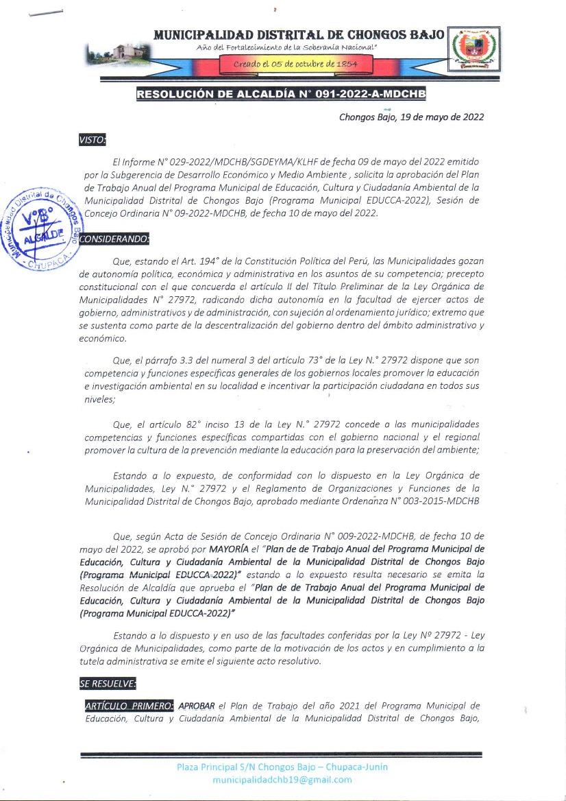 La presente Resolución aprueba el Plan de Trabajo 2022 del Programa Municipal de Educación, Cultura y Ciudadanía Ambiental de la Municipalidad Distrital de Chongos Bajo, con la finalidad de definir las actividades de educación, cultura y ciudadanía ambiental que se desarrollarán en la localidad durante el presente año.