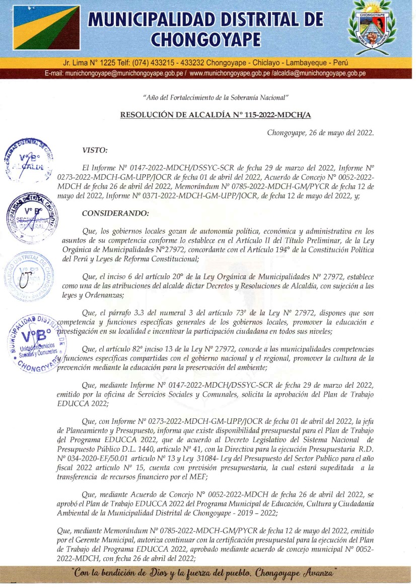 La presente Resolución aprueba el Plan de Trabajo 2022 del Programa Municipal de Educación, Cultura y Ciudadanía Ambiental de la Municipalidad Distrital de Chongoyape, con la finalidad de definir las actividades de educación, cultura y ciudadanía ambiental que se desarrollarán en la localidad durante el presente año.