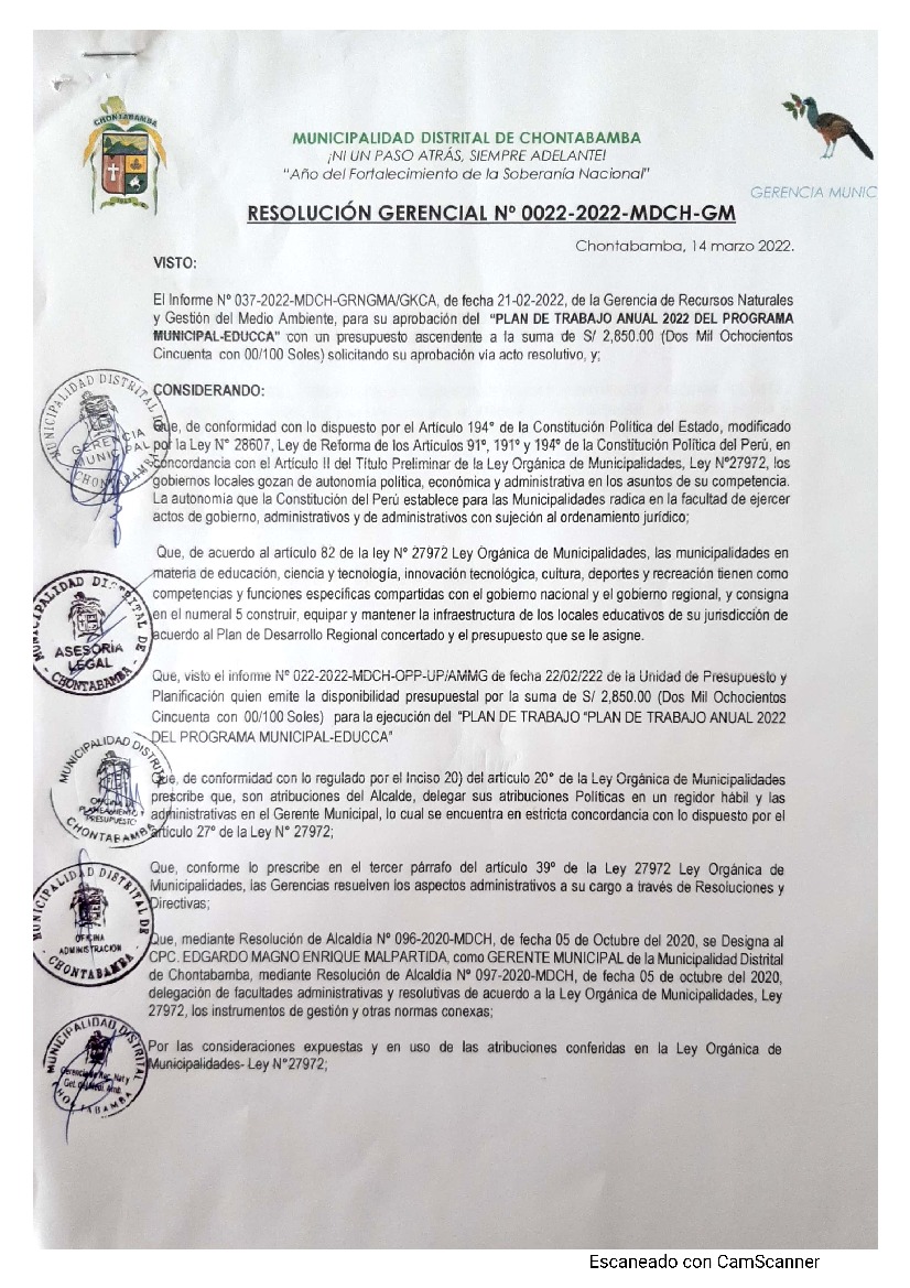 La presente Resolución aprueba el Plan de Trabajo 2022 del Programa Municipal de Educación, Cultura y Ciudadanía Ambiental de la Municipalidad Distrital de Chontabamba, con la finalidad de definir las actividades de educación, cultura y ciudadanía ambiental que se desarrollarán en la localidad durante el presente año.