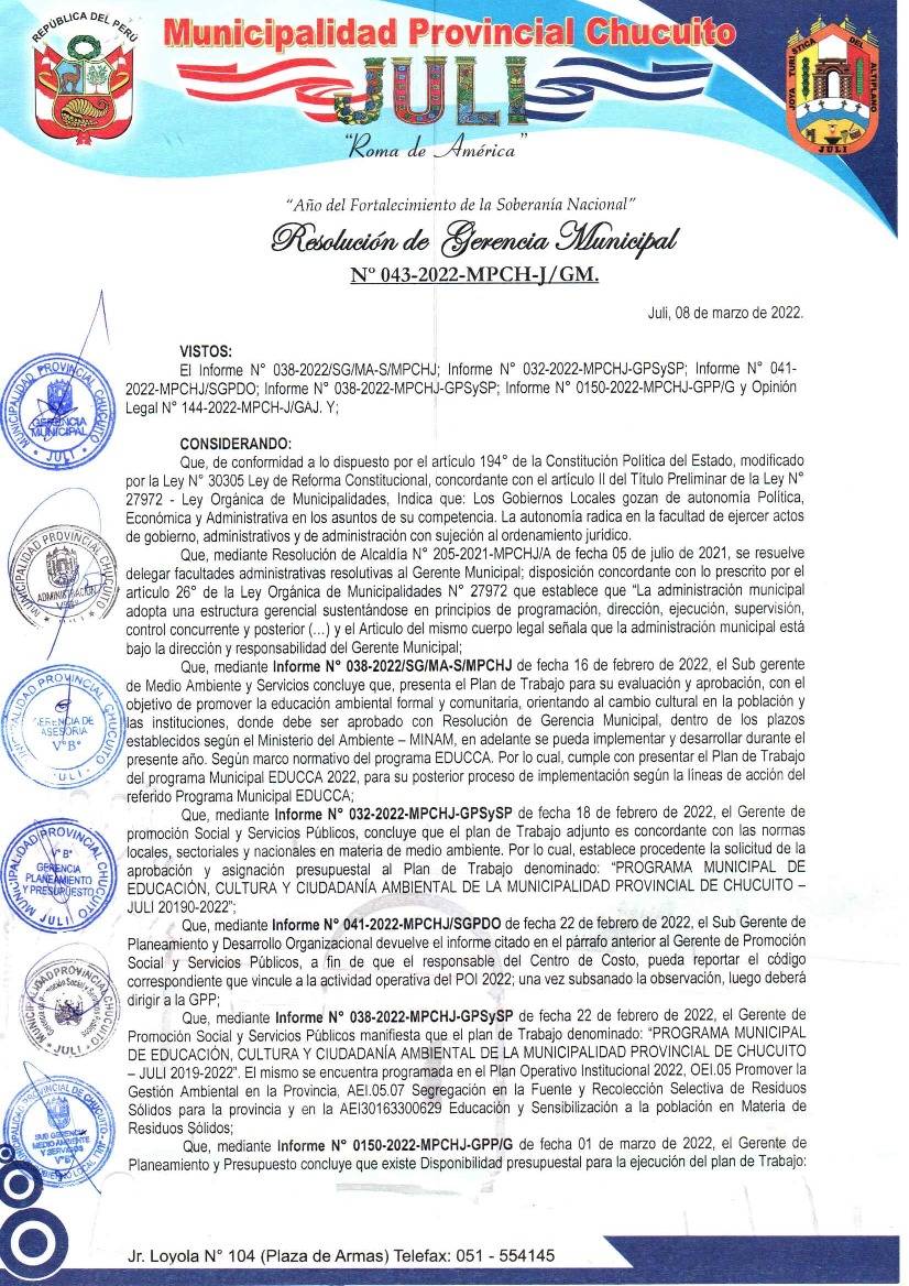 La presente Resolución aprueba el Plan de Trabajo 2022 del Programa Municipal de Educación, Cultura y Ciudadanía Ambiental de la Municipalidad Provincial de Chucuito, con la finalidad de definir las actividades de educación, cultura y ciudadanía ambiental que se desarrollarán en la localidad durante el presente año.
