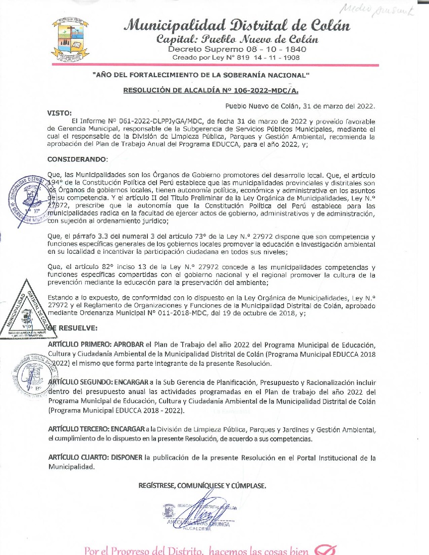 La presente Resolución aprueba el Plan de Trabajo 2022 del Programa Municipal de Educación, Cultura y Ciudadanía Ambiental de la Municipalidad Distrital de Colán, con la finalidad de definir las actividades de educación, cultura y ciudadanía ambiental que se desarrollarán en la localidad durante el presente año.
