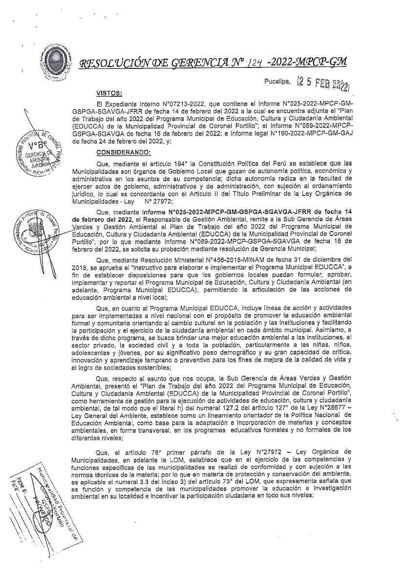 La presente Resolución aprueba el Plan de Trabajo 2022 del Programa Municipal de Educación, Cultura y Ciudadanía Ambiental de la Municipalidad Provincia de Coronel Portillo, con la finalidad de definir las actividades de educación, cultura y ciudadanía ambiental que se desarrollarán en la localidad durante el presente año.