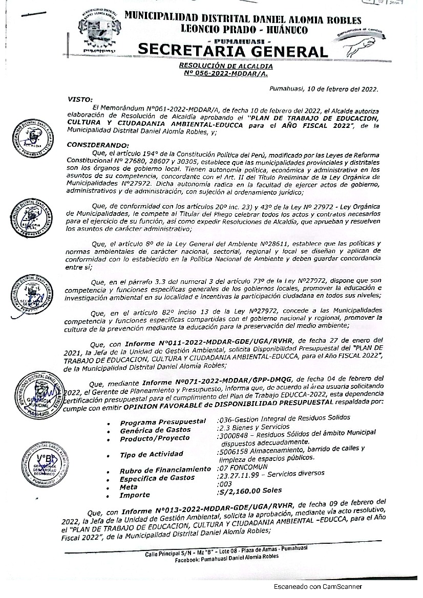 La presente Resolución aprueba el Plan de Trabajo 2022 del Programa Municipal de Educación, Cultura y Ciudadanía Ambiental de la Municipalidad Distrital de Daniel Alomía Robles, con la finalidad de definir las actividades de educación, cultura y ciudadanía ambiental que se desarrollarán en la localidad durante el presente año.