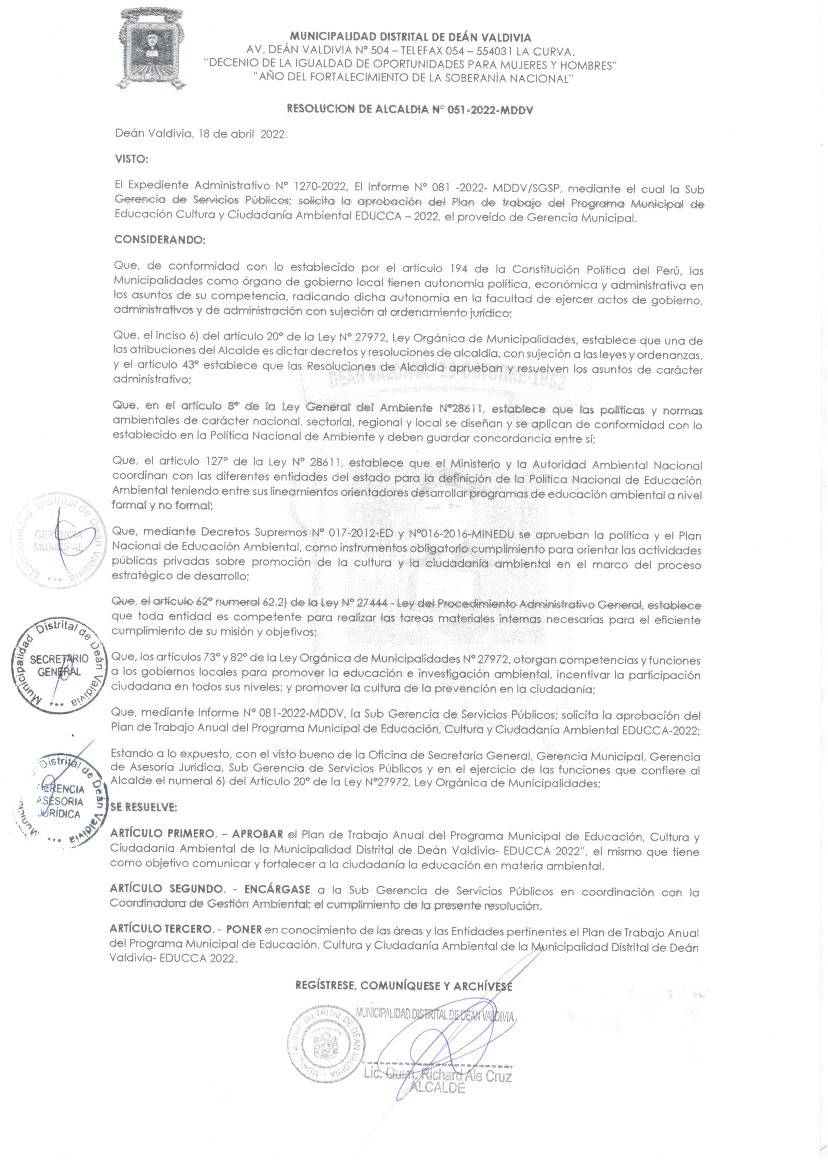 Plan de Trabajo 2022 del Programa Municipal EDUCCA - Dean Valdivia