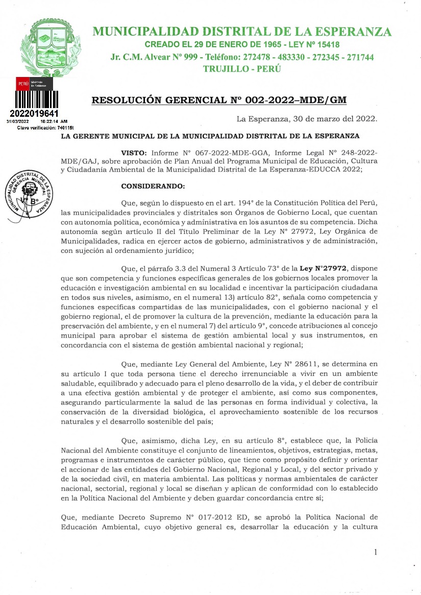 La presente Resolución aprueba el Plan de Trabajo 2022 del Programa Municipal de Educación, Cultura y Ciudadanía Ambiental de la Municipalidad Distrital de La Esperanza, con la finalidad de definir las actividades de educación, cultura y ciudadanía ambiental que se desarrollarán en la localidad durante el presente año.