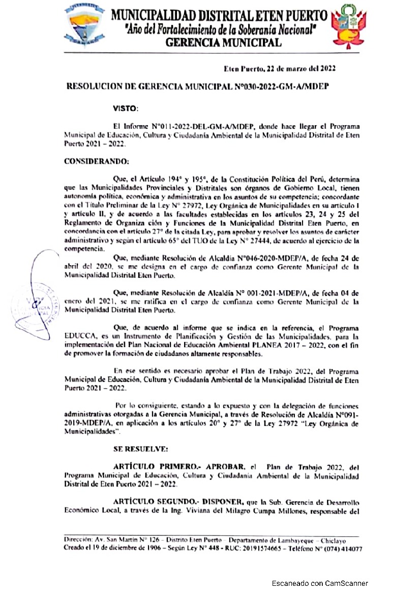 La presente Resolución aprueba el Plan de Trabajo 2022 del Programa Municipal de Educación, Cultura y Ciudadanía Ambiental de la Municipalidad Distrital de Eten Puerto, con la finalidad de definir las actividades de educación, cultura y ciudadanía ambiental que se desarrollarán en la localidad durante el presente año.