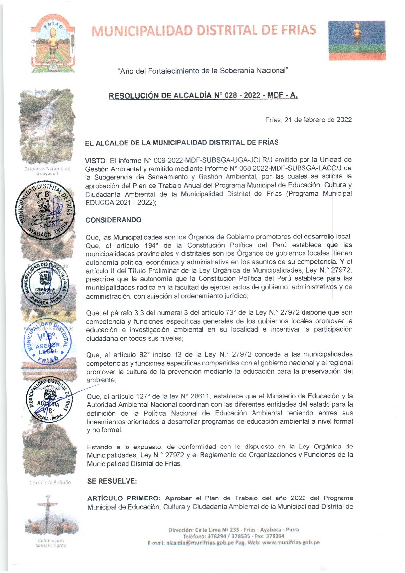 La presente Resolución aprueba el Plan de Trabajo 2022 del Programa Municipal de Educación, Cultura y Ciudadanía Ambiental de la Municipalidad Distrital de Frías, con la finalidad de definir las actividades de educación, cultura y ciudadanía ambiental que se desarrollarán en la localidad durante el presente año.