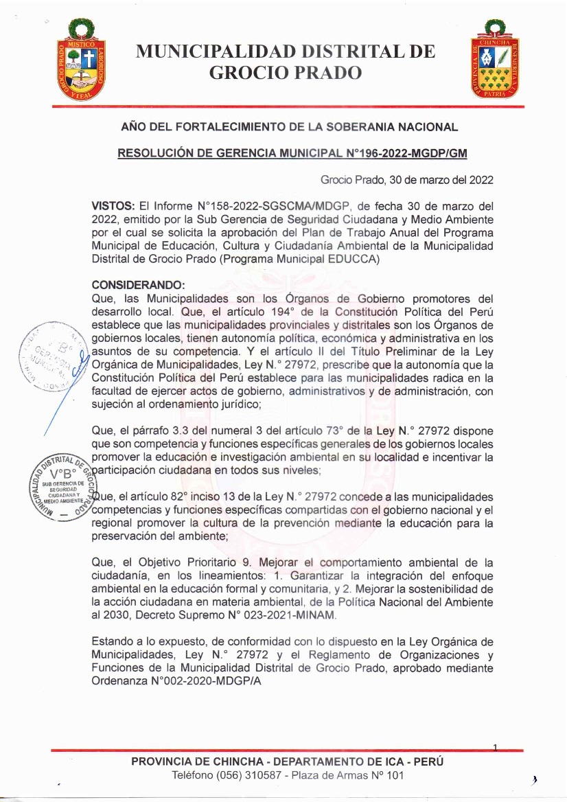La presente Resolución aprueba el Plan de Trabajo 2022 del Programa Municipal de Educación, Cultura y Ciudadanía Ambiental de la Municipalidad Distrital de Grocio Prado - Chincha, con la finalidad de definir las actividades de educación, cultura y ciudadanía ambiental que se desarrollarán en la localidad durante el presente año.