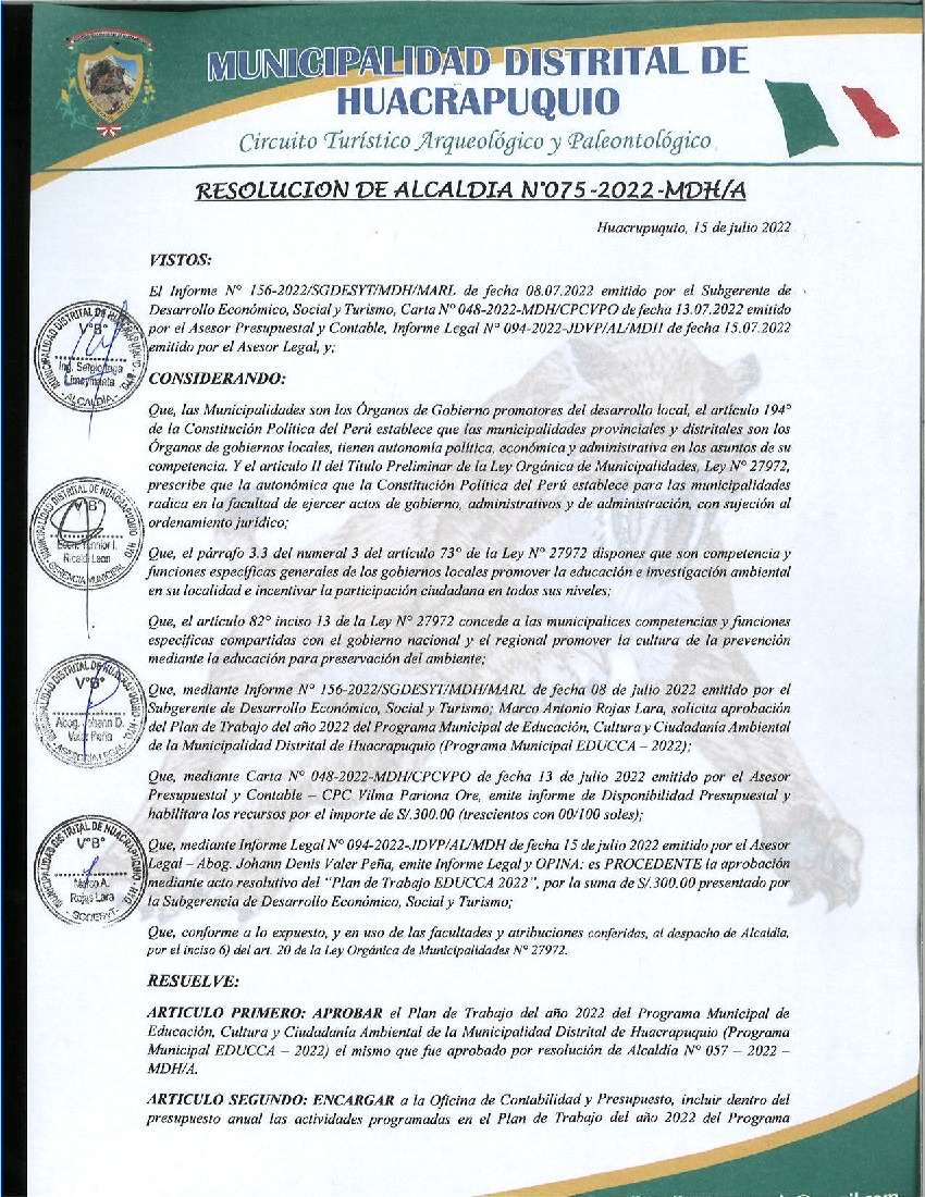 La presente Resolución aprueba el Plan de Trabajo 2022 del Programa Municipal de Educación, Cultura y Ciudadanía Ambiental de la Municipalidad Distrital de Huacrapuquio, con la finalidad de definir las actividades de educación, cultura y ciudadanía ambiental que se desarrollarán en la localidad durante el presente año.