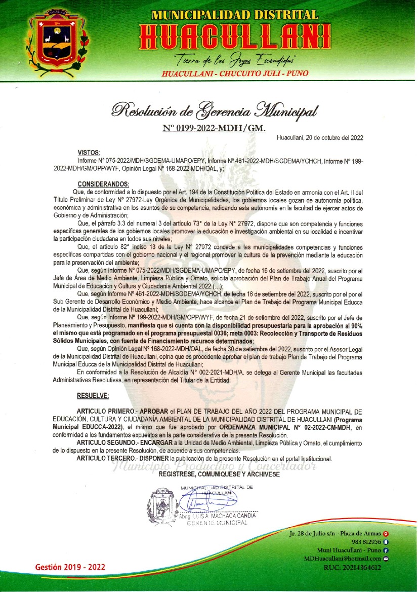 La presente Resolución aprueba el Plan de Trabajo 2022 del Programa Municipal de Educación, Cultura y Ciudadanía Ambiental de la Municipalidad Distrital de Huacullani, con la finalidad de definir las actividades de educación, cultura y ciudadanía ambiental que se desarrollarán en la localidad durante el presente año.
