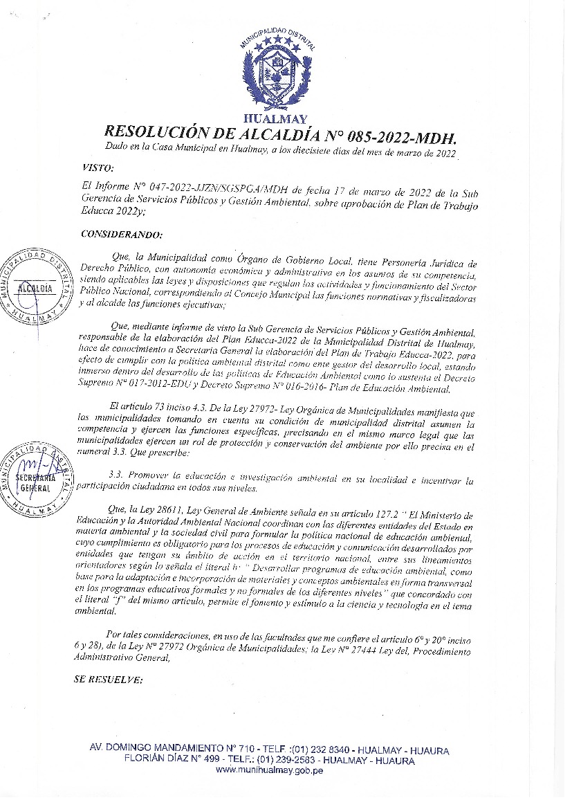 La presente Resolución aprueba el Plan de Trabajo 2022 del Programa Municipal de Educación, Cultura y Ciudadanía Ambiental de la Municipalidad Distrital de Hualmay - Huaura, con la finalidad de definir las actividades de educación, cultura y ciudadanía ambiental que se desarrollarán en la localidad durante el presente año.