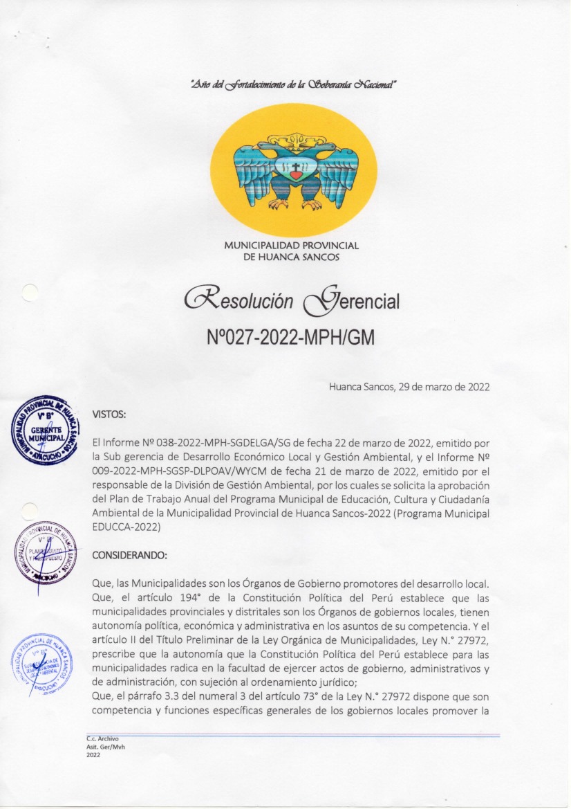 La presente Resolución aprueba el Plan de Trabajo 2022 del Programa Municipal de Educación, Cultura y Ciudadanía Ambiental de la Municipalidad Provincial de Huanca Sancos, con la finalidad de definir las actividades de educación, cultura y ciudadanía ambiental que se desarrollarán en la localidad durante el presente año.