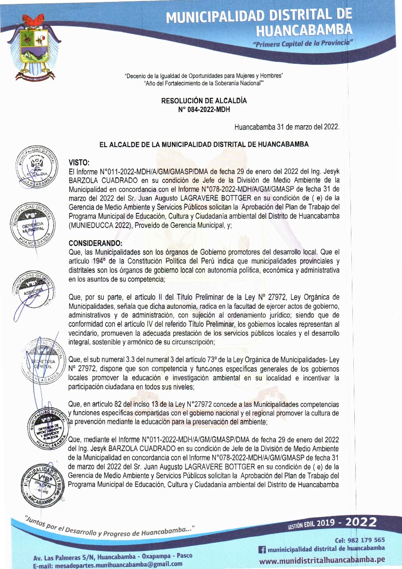 La presente Resolución aprueba el Plan de Trabajo 2022 del Programa Municipal de Educación, Cultura y Ciudadanía Ambiental de la Municipalidad Distrital de Huancabamba, con la finalidad de definir las actividades de educación, cultura y ciudadanía ambiental que se desarrollarán en la localidad durante el presente año.