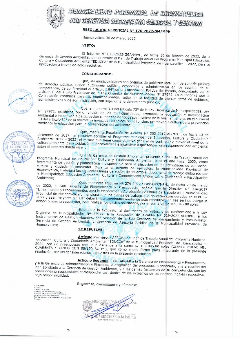 La presente Resolución aprueba el Plan de Trabajo 2022 del Programa Municipal de Educación, Cultura y Ciudadanía Ambiental de la Municipalidad Provincial de Huancavelica, con la finalidad de definir las actividades de educación, cultura y ciudadanía ambiental que se desarrollarán en la localidad durante el presente año.
