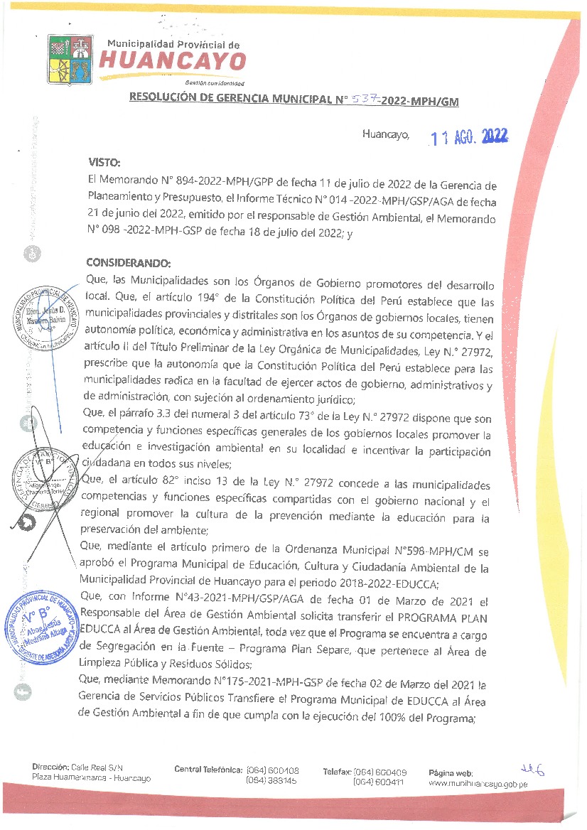 La presente Resolución aprueba el Plan de Trabajo 2022 del Programa Municipal de Educación, Cultura y Ciudadanía Ambiental de la Municipalidad Provincial de Huancayo, con la finalidad de definir las actividades de educación, cultura y ciudadanía ambiental que se desarrollarán en la localidad durante el presente año.