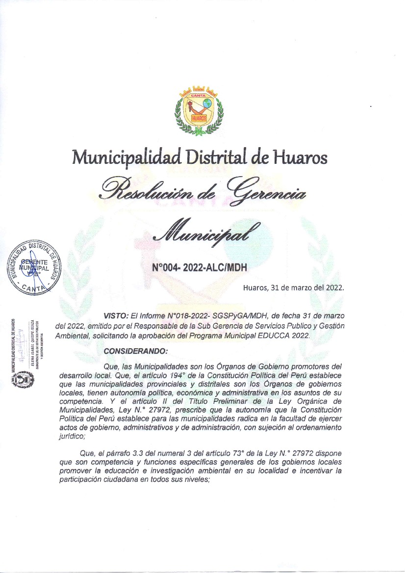 La presente Resolución aprueba el Plan de Trabajo 2022 del Programa Municipal de Educación, Cultura y Ciudadanía Ambiental de la Municipalidad Distrital de Huaros - Canta, con la finalidad de definir las actividades de educación, cultura y ciudadanía ambiental que se desarrollarán en la localidad durante el presente año.