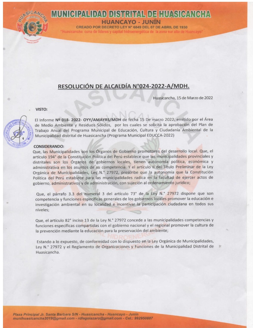 La presente Resolución aprueba el Plan de Trabajo 2022 del Programa Municipal de Educación, Cultura y Ciudadanía Ambiental de la Municipalidad Distrital de Huasicancha, con la finalidad de definir las actividades de educación, cultura y ciudadanía ambiental que se desarrollarán en la localidad durante el presente año.