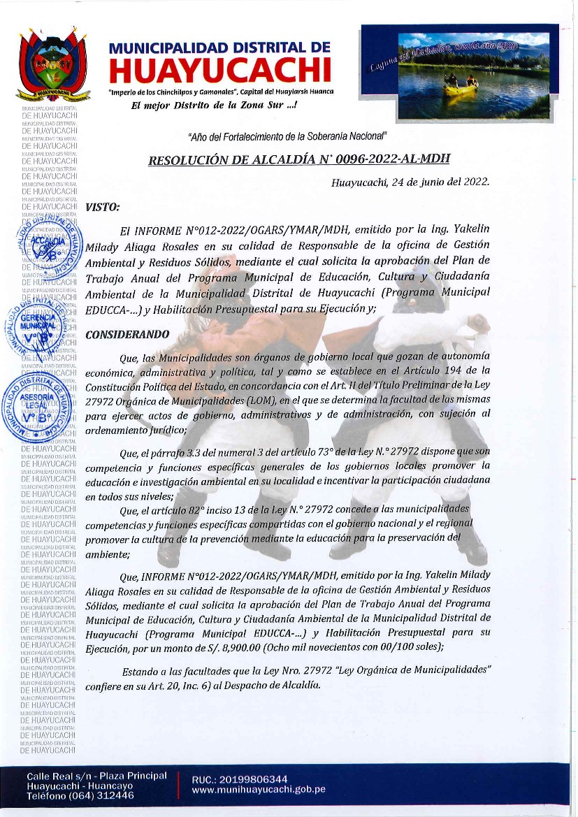 La presente Resolución aprueba el Plan de Trabajo 2022 del Programa Municipal de Educación, Cultura y Ciudadanía Ambiental de la Municipalidad Distrital de Huayucachi, con la finalidad de definir las actividades de educación, cultura y ciudadanía ambiental que se desarrollarán en la localidad durante el presente año.