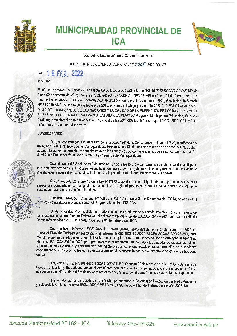 La presente Resolución aprueba el Plan de Trabajo 2022 del Programa Municipal de Educación, Cultura y Ciudadanía Ambiental de la Municipalidad Provincial de Ica, con la finalidad de definir las actividades de educación, cultura y ciudadanía ambiental que se desarrollarán en la localidad durante el presente año.