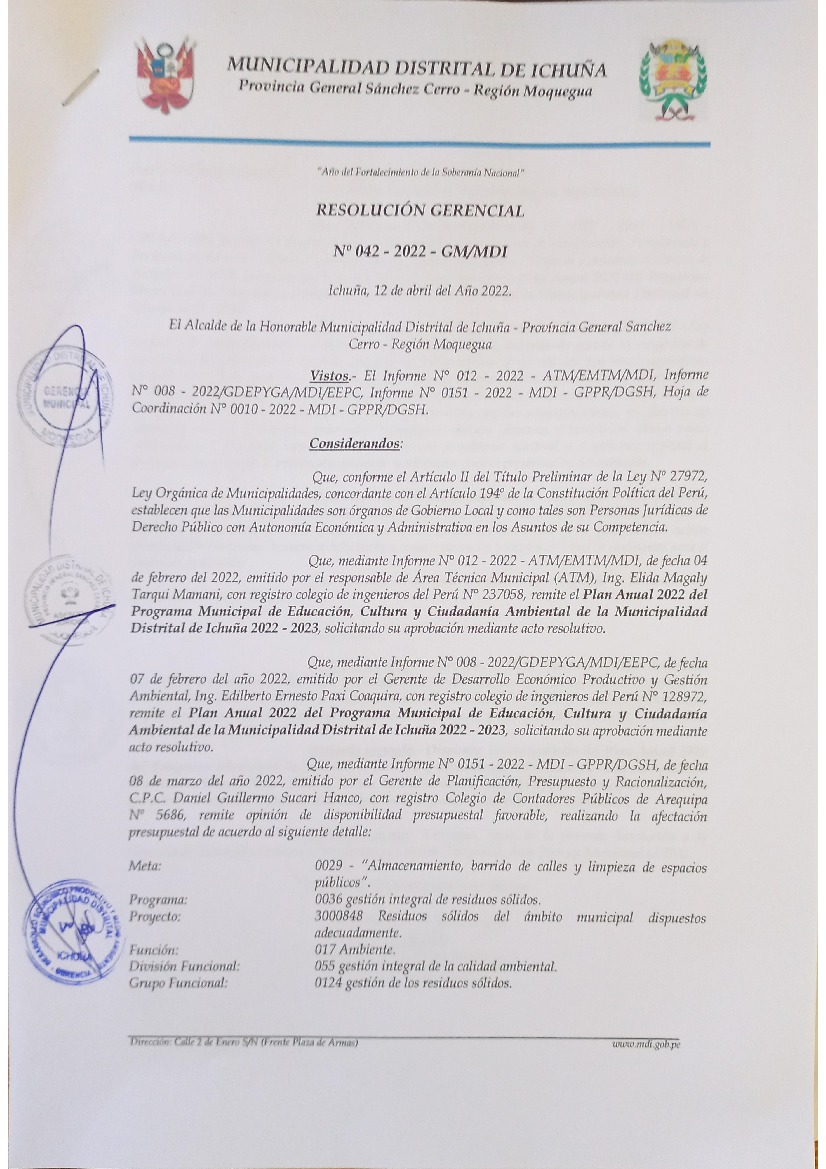 La presente Resolución aprueba el Plan de Trabajo 2022 del Programa Municipal de Educación, Cultura y Ciudadanía Ambiental de la Municipalidad Distrital de Ichuña - General Sánchez Cerro - Moquegua, con la finalidad de definir las actividades de educación, cultura y ciudadanía ambiental que se desarrollarán en la localidad durante el presente año.