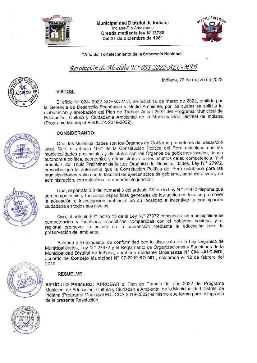 La presente Resolución aprueba el Plan de Trabajo 2022 del Programa Municipal de Educación, Cultura y Ciudadanía Ambiental de la Municipalidad Distrital de Indiana, con la finalidad de definir las actividades de educación, cultura y ciudadanía ambiental que se desarrollarán en la localidad durante el presente año.