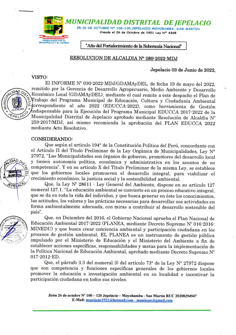 La presente Resolución aprueba el Plan de Trabajo 2022 del Programa Municipal de Educación, Cultura y Ciudadanía Ambiental de la Municipalidad Distrital de Jepelacio, con la finalidad de definir las actividades de educación, cultura y ciudadanía ambiental que se desarrollarán en la localidad durante el presente año.