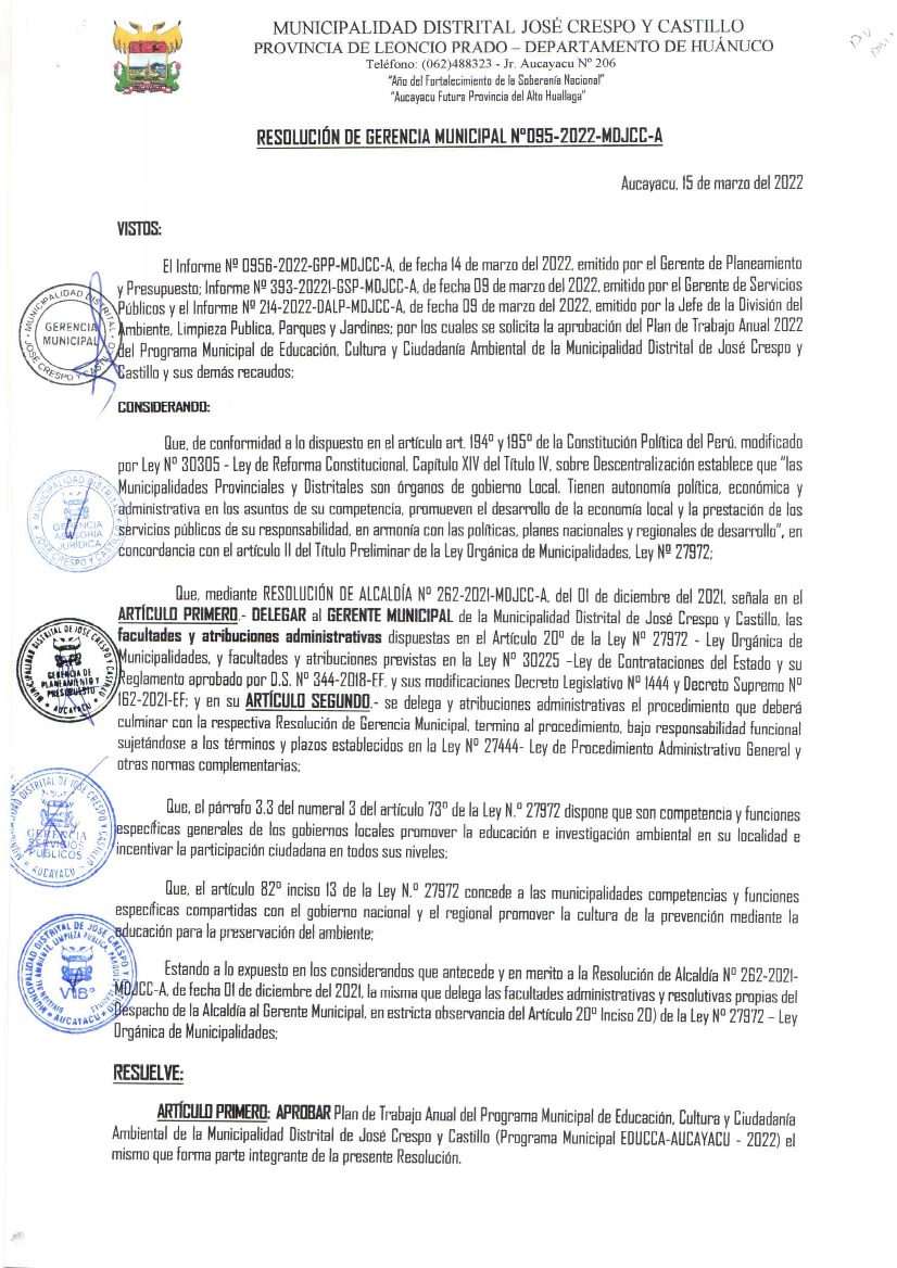 La presente Resolución aprueba el Plan de Trabajo 2022 del Programa Municipal de Educación, Cultura y Ciudadanía Ambiental de la Municipalidad Distrital de José Crespo y Castillo, con la finalidad de definir las actividades de educación, cultura y ciudadanía ambiental que se desarrollarán en la localidad durante el presente año.