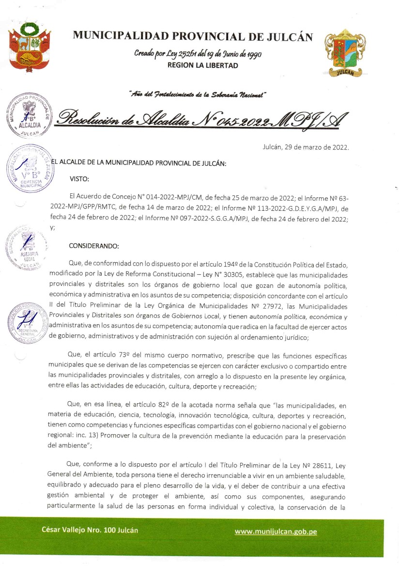 La presente Resolución aprueba el Plan de Trabajo 2022 del Programa Municipal de Educación, Cultura y Ciudadanía Ambiental de la Municipalidad Provincial de Julcán, con la finalidad de definir las actividades de educación, cultura y ciudadanía ambiental que se desarrollarán en la localidad durante el presente año.