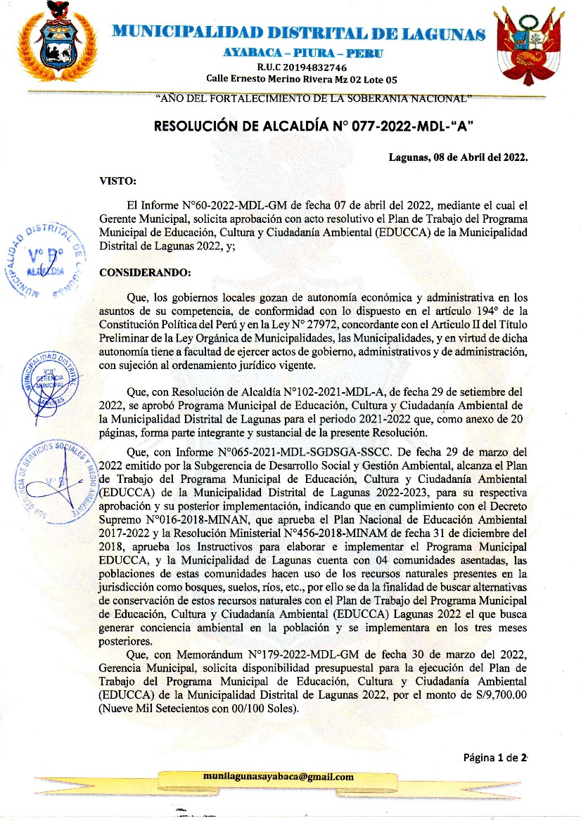 La presente Resolución aprueba el Plan de Trabajo 2022 del Programa Municipal de Educación, Cultura y Ciudadanía Ambiental de la Municipalidad Distrital de Lagunas, con la finalidad de definir las actividades de educación, cultura y ciudadanía ambiental que se desarrollarán en la localidad durante el presente año.