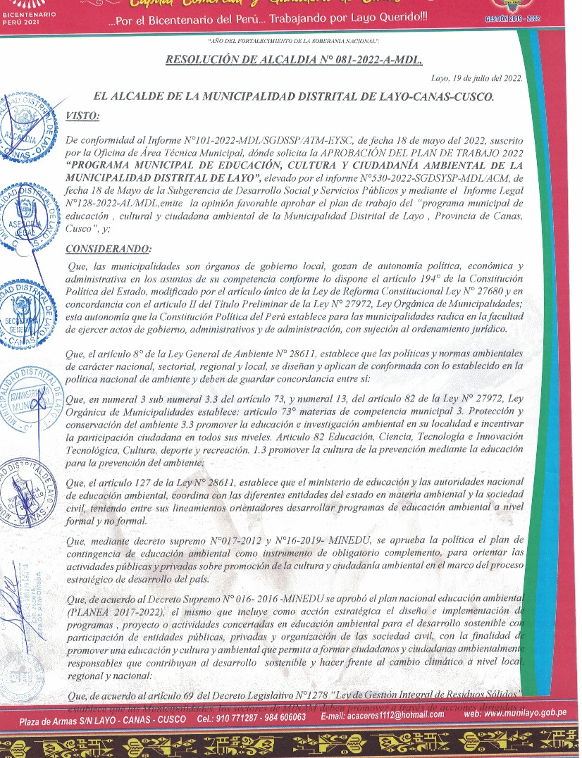 La presente Resolución aprueba el Plan de Trabajo 2022 del Programa Municipal de Educación, Cultura y Ciudadanía Ambiental de la Municipalidad Distrital de Layo, Canas, Cusco), con la finalidad de definir las actividades de educación, cultura y ciudadanía ambiental que se desarrollarán en la localidad durante el presente año.