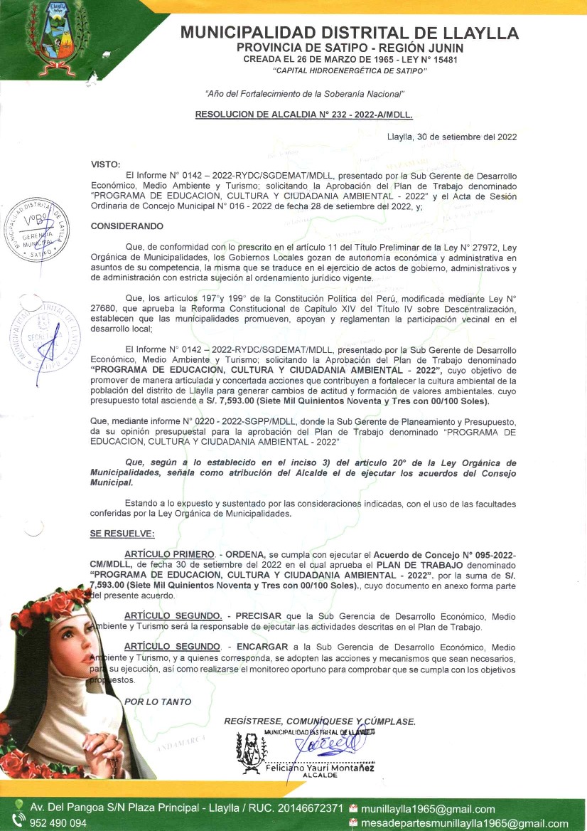 La presente Resolución aprueba el Plan de Trabajo 2022 del Programa Municipal de Educación, Cultura y Ciudadanía Ambiental de la Municipalidad Distrital de Llaylla, con la finalidad de definir las actividades de educación, cultura y ciudadanía ambiental que se desarrollarán en la localidad durante el presente año.