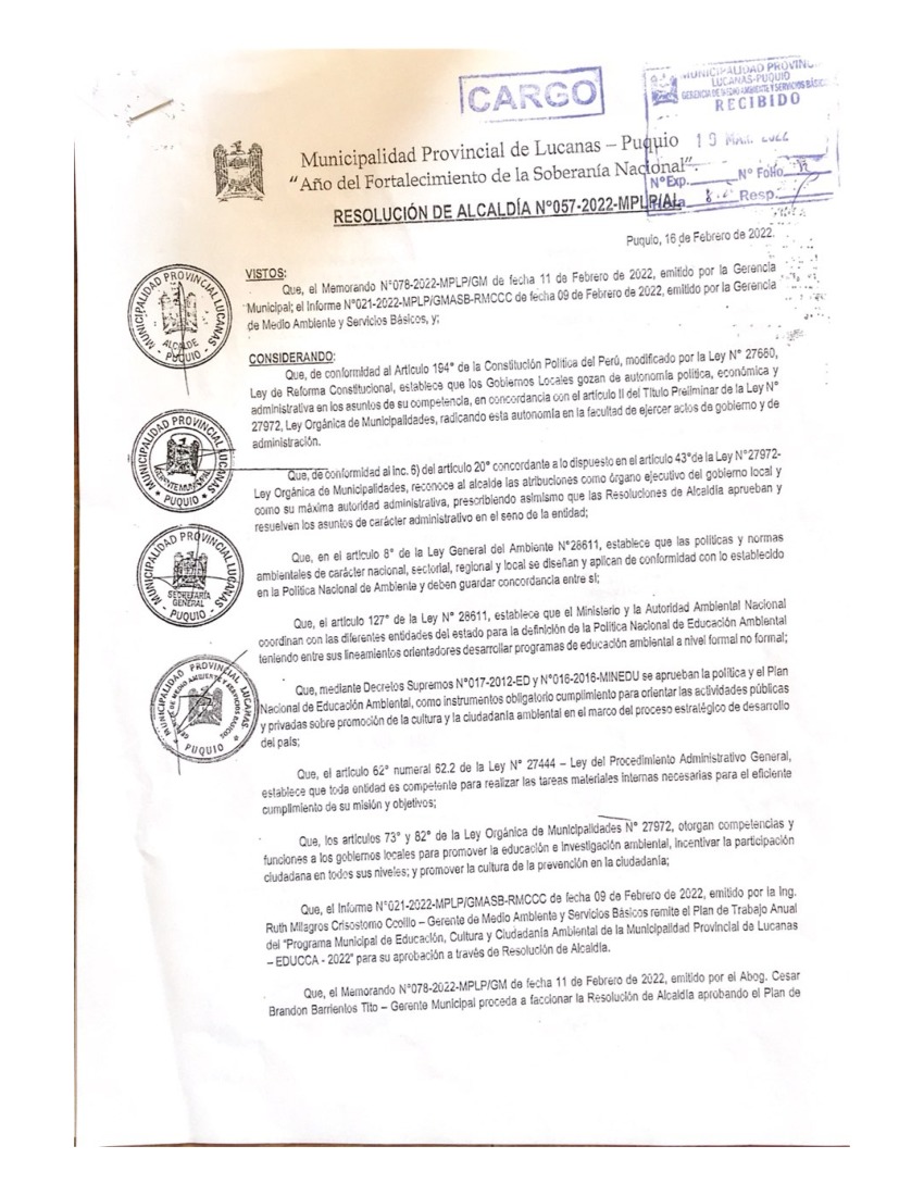 La presente Resolución aprueba el Plan de Trabajo 2022 del Programa Municipal de Educación, Cultura y Ciudadanía Ambiental de la Municipalidad Provincial de Lucanas, con la finalidad de definir las actividades de educación, cultura y ciudadanía ambiental que se desarrollarán en la localidad durante el presente año.