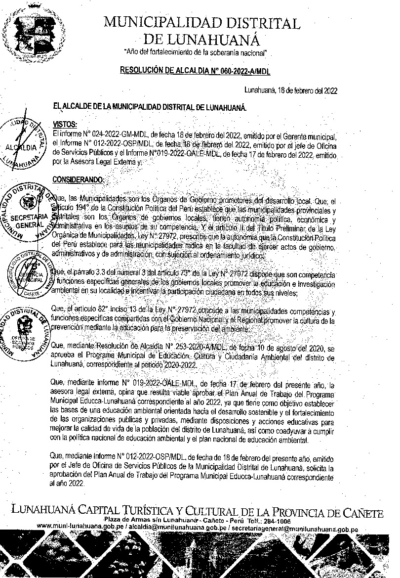 La presente Resolución aprueba el Plan de Trabajo 2022 del Programa Municipal de Educación, Cultura y Ciudadanía Ambiental de la Municipalidad Distrital de Lunahuaná - Cañete, con la finalidad de definir las actividades de educación, cultura y ciudadanía ambiental que se desarrollarán en la localidad durante el presente año.